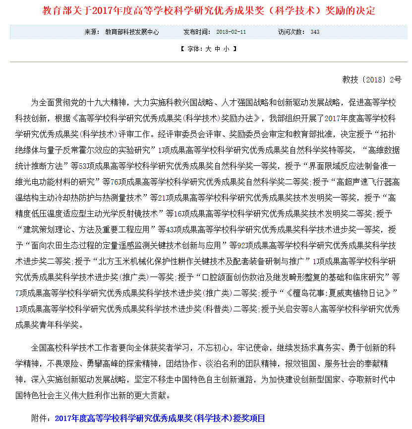 教育部关于2017年度高等学校科学研究优秀成果奖(科学技术)奖励的决定